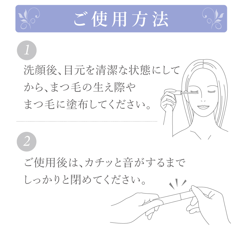 洗顔後、目元を清潔な状態にしてから、まつ毛の生え際やまつ毛に塗布してください。